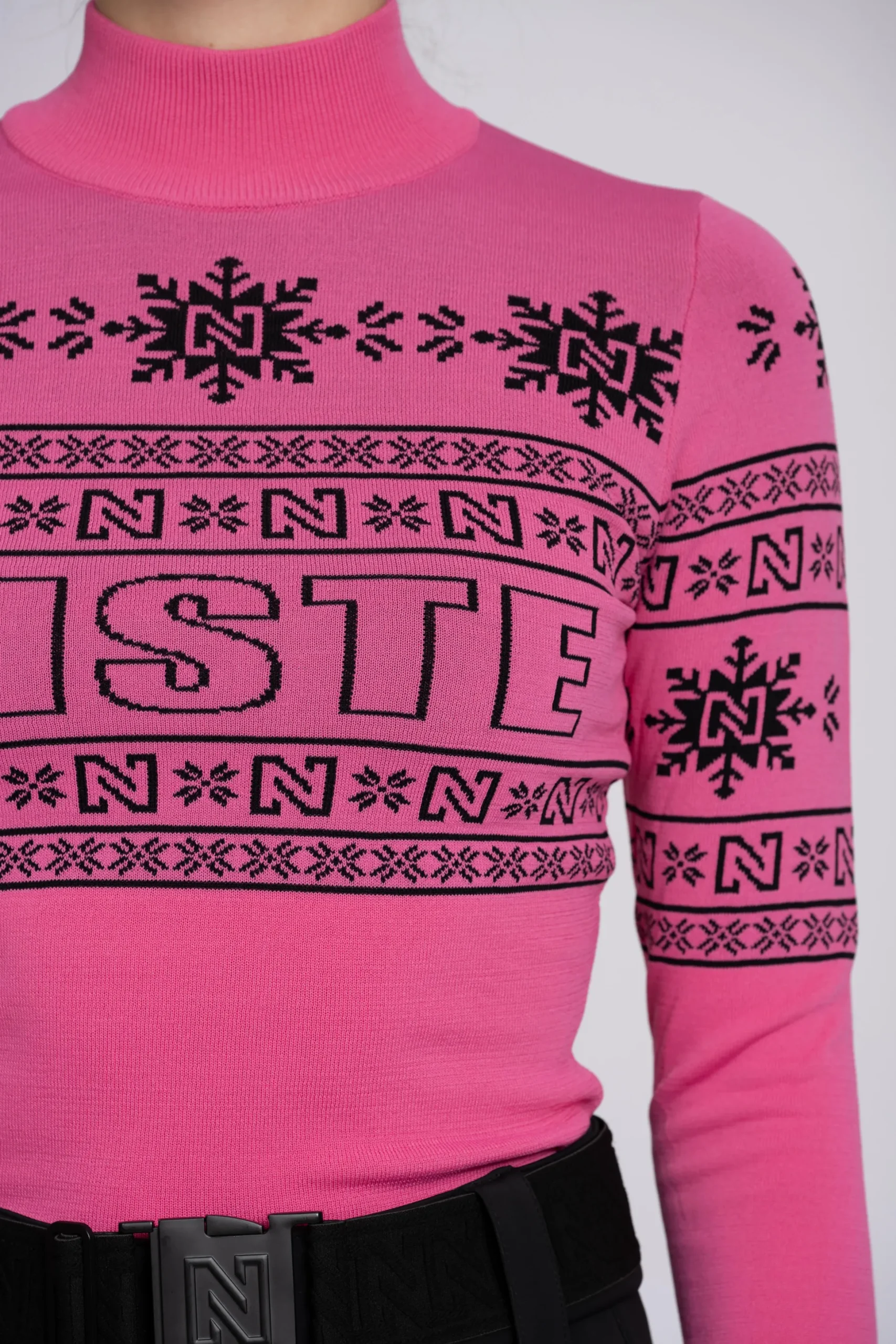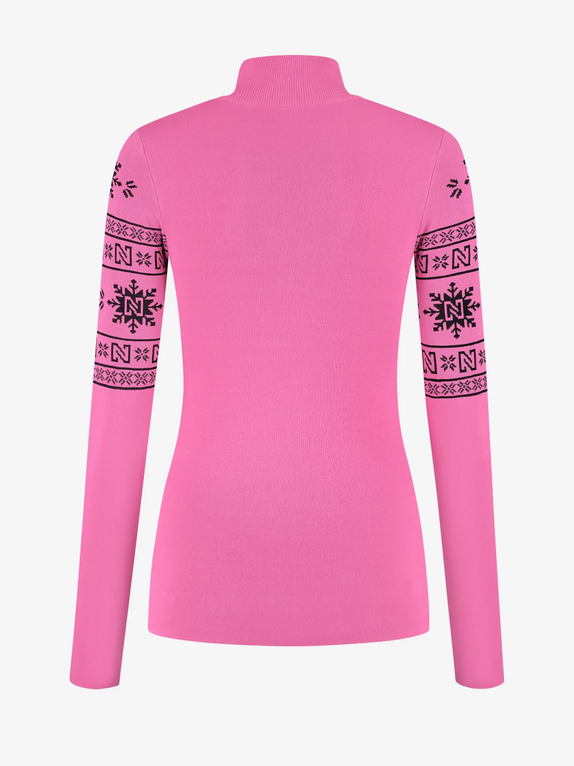 Aansluitende top met een NIKKIE logo patroon, een hogecol en veel stretch.