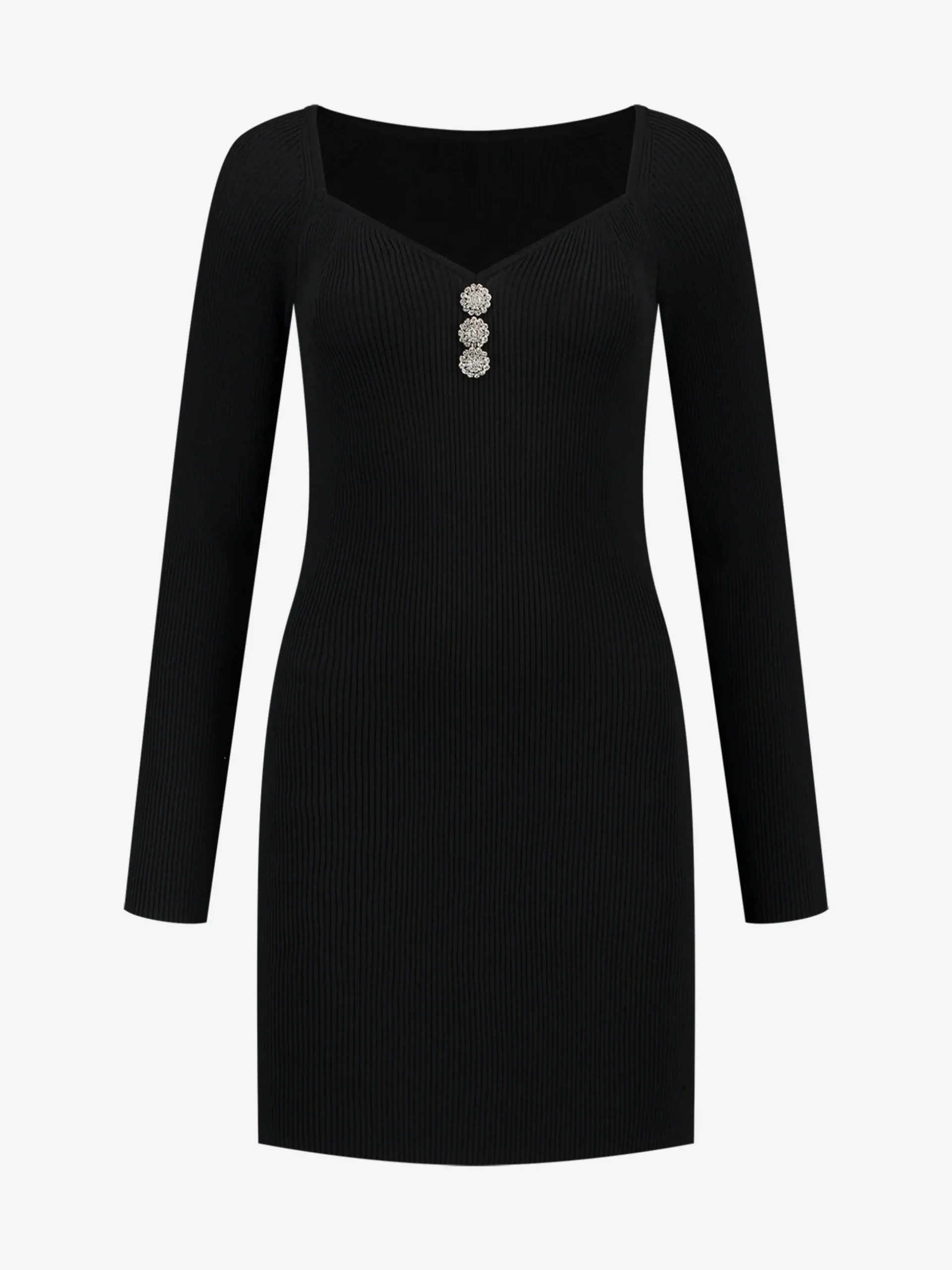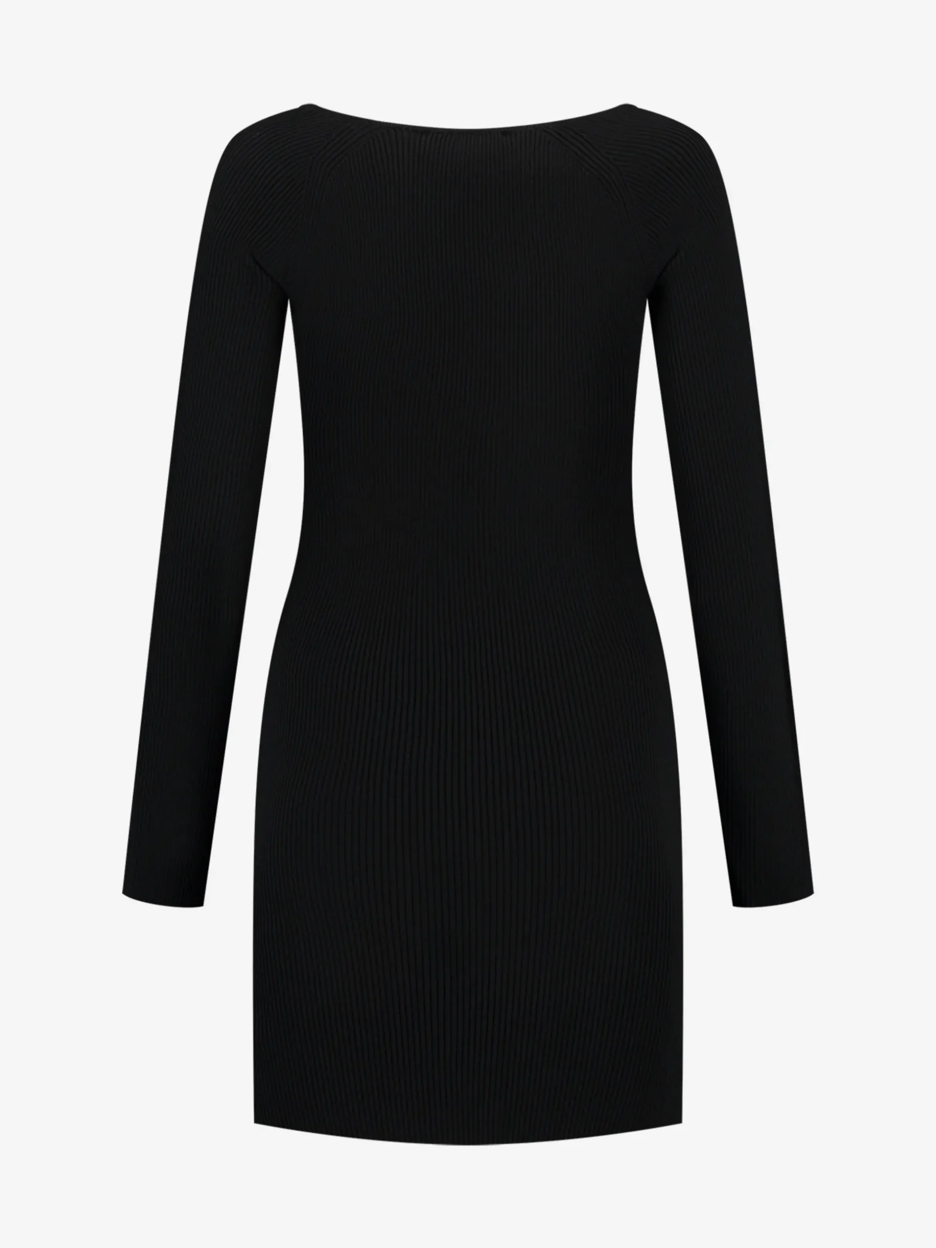 Geribbelde jurk met een getailleerde pasvorm, eenvierkante hals, split mouwen en sierknopen.