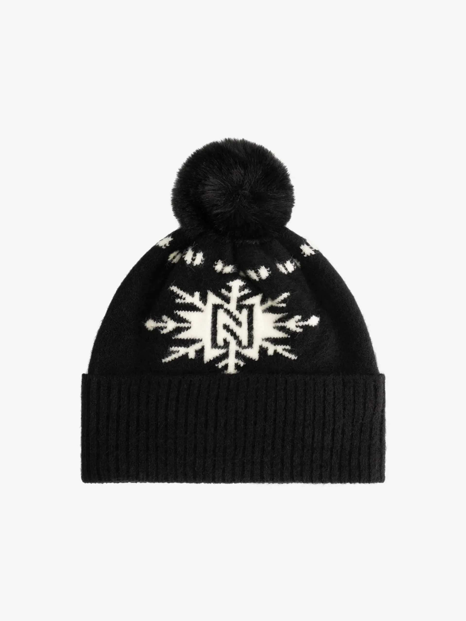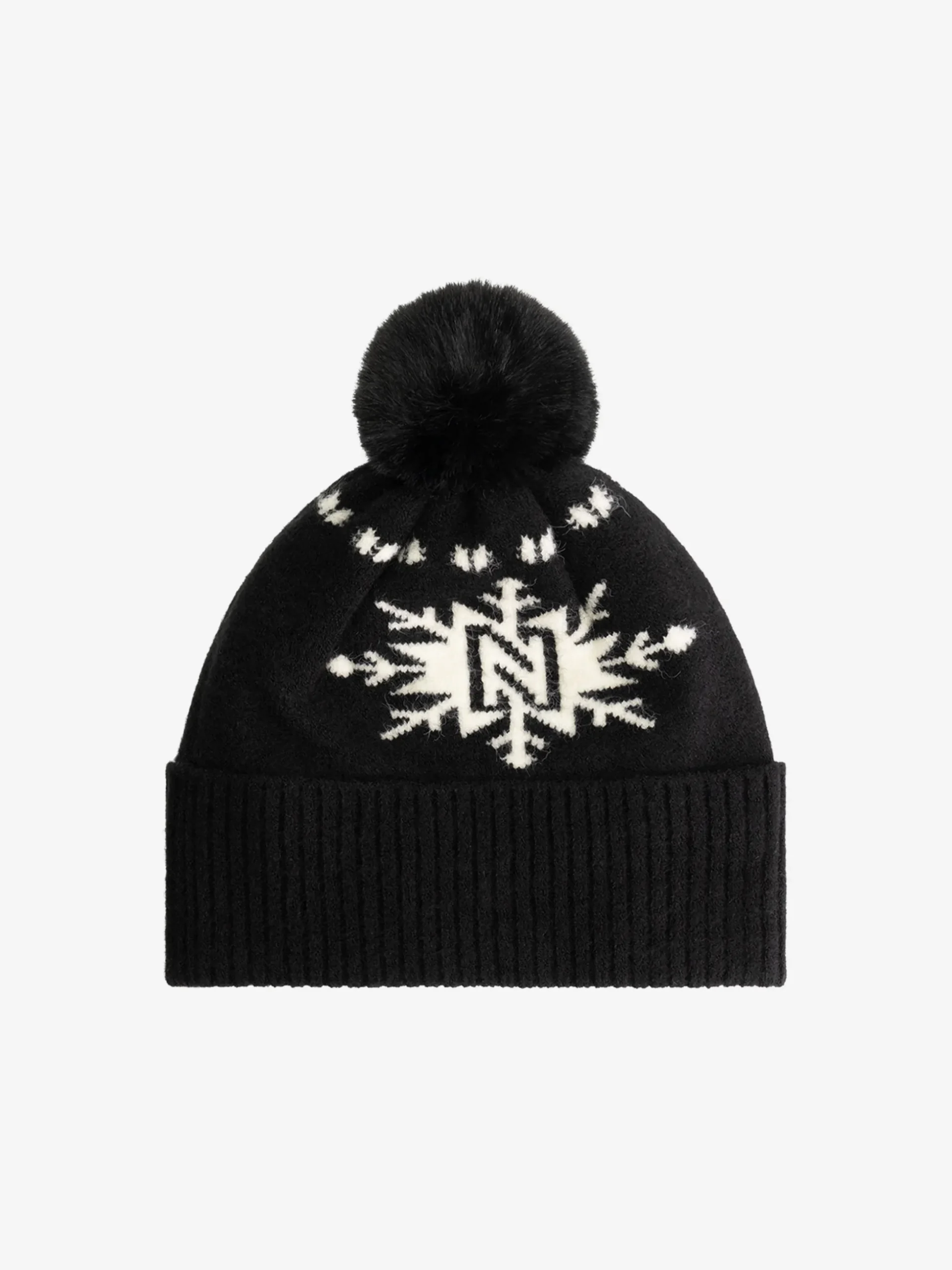 Muts met een logo patroon en een fluffy pompon, afgewerktmet een omslagrand.