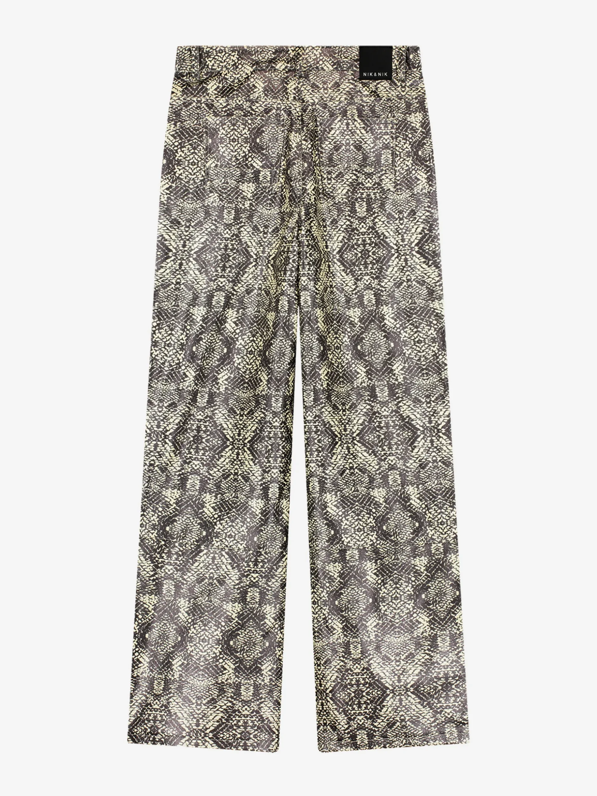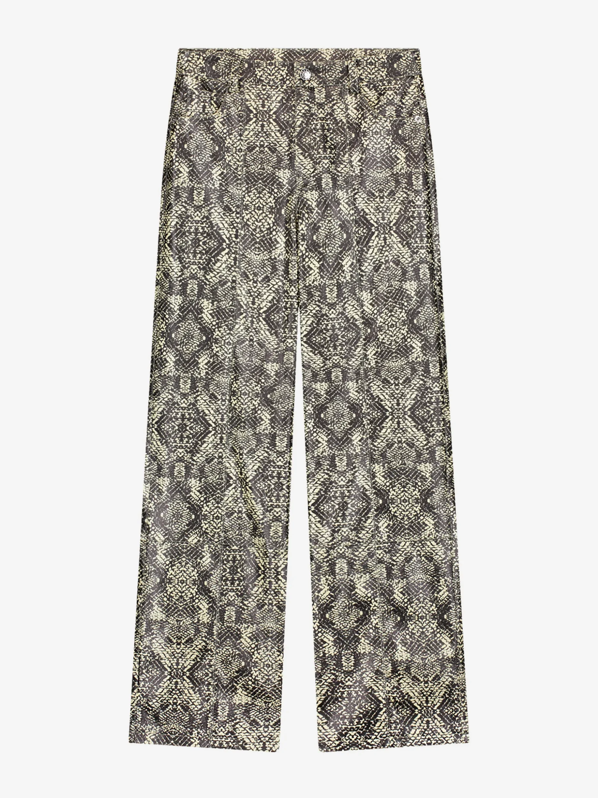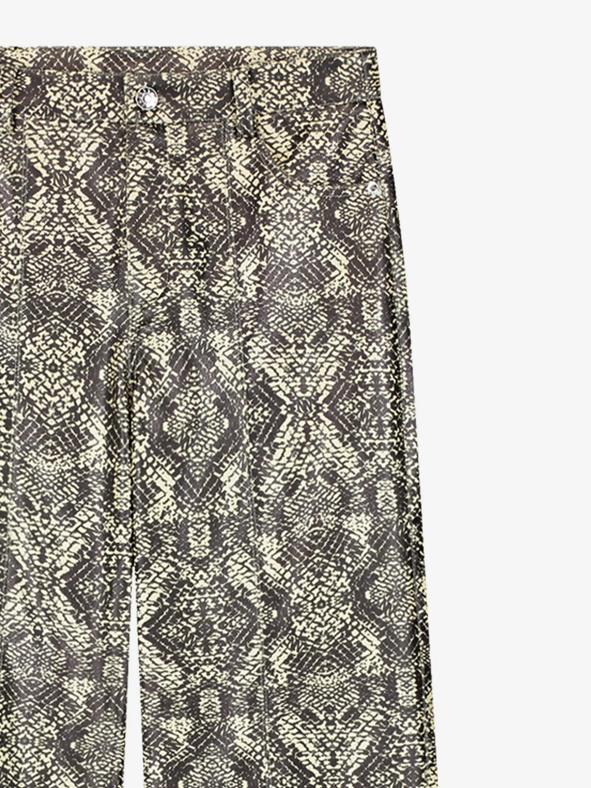 Een broek met slangenprint, rechte pijpen en eenmiddelhoge taille. De broek is uitgerust met een ritssluiting, knoopsluiting enheeft zakken zowel aan de voor- als achterkant.