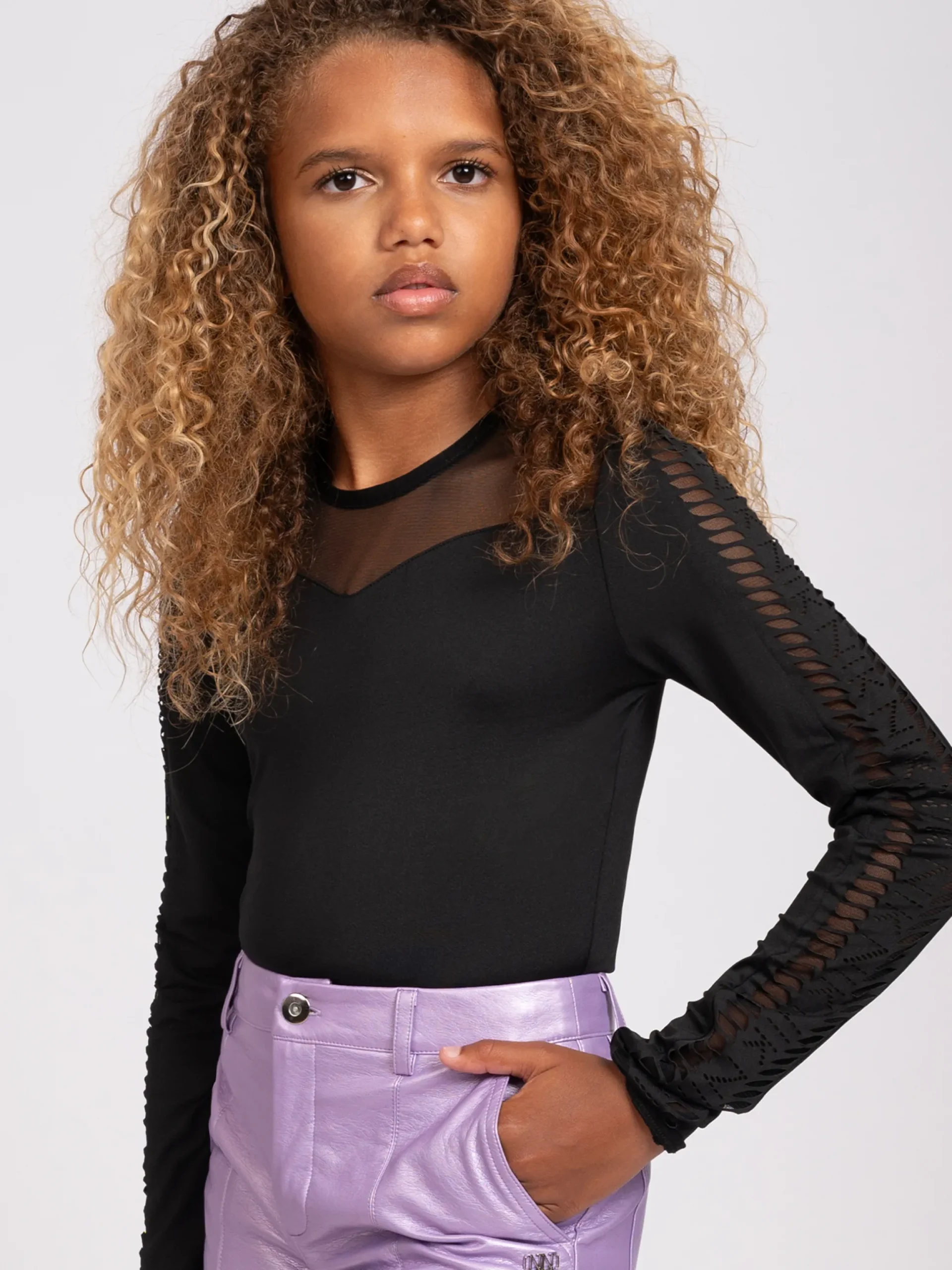 - Mesh details op de mouwen en borst