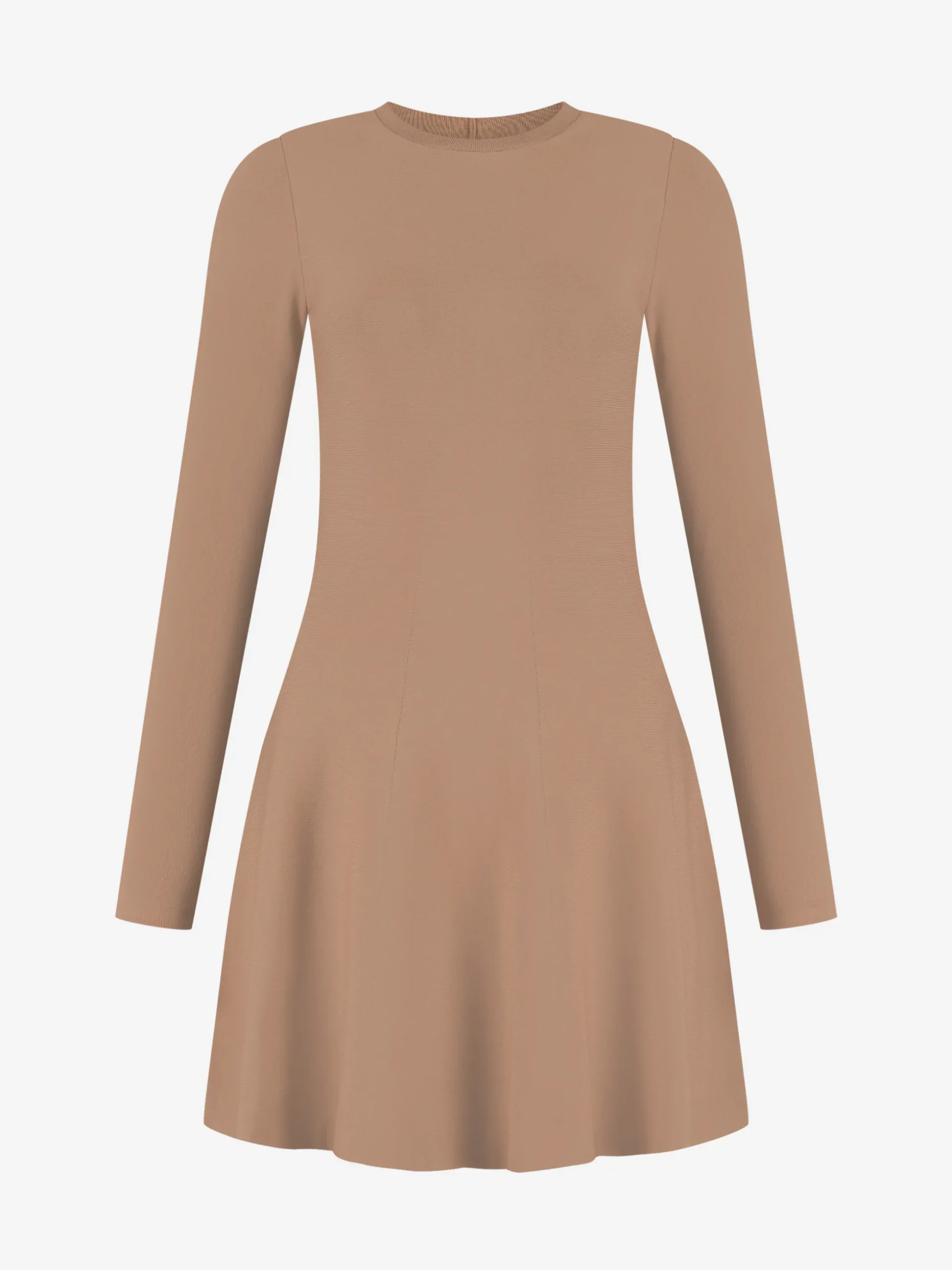 Een a-lijn jurk met lange mouwen en een ronde halslijn.