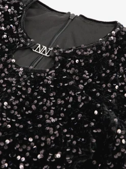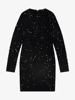 Aansluitende jurk met pailletten, een ritsluiting op de rug en een ronde hals. De jurk heeft veel stretch en een open detail bij de hals met een NIK&NIK logo.