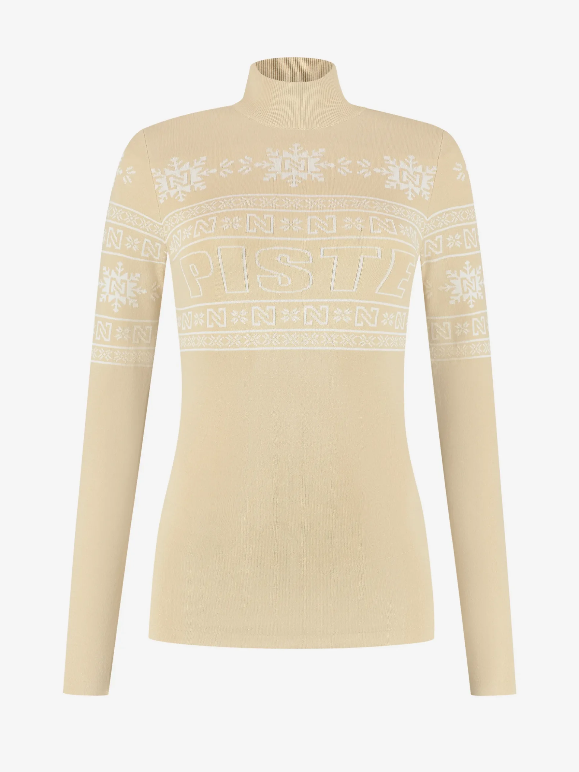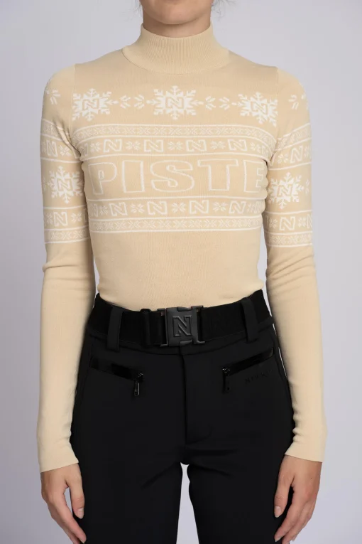 Aansluitende top met een NIKKIE logo patroon, een hogecol en veel stretch.