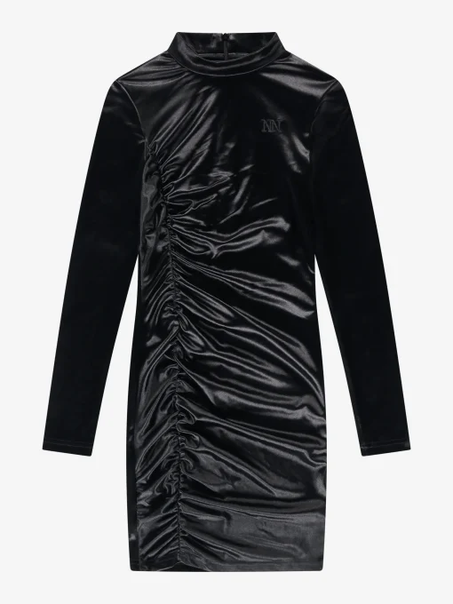 Velvet look jurk met een aansluitende pasvorm, ronde hals en een gedrapeerd detail. De jurk heeft veel stretch, een ritssluitng op de rug en een subtiel NIK&NIK logo.
