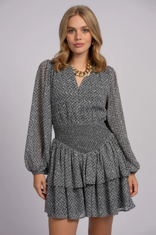 Jurk met een all-over print, V-hals, knoopsluiting en eenA-lijn pasvorm. De jurk heeft een elastische taille en gelaagde ruches.