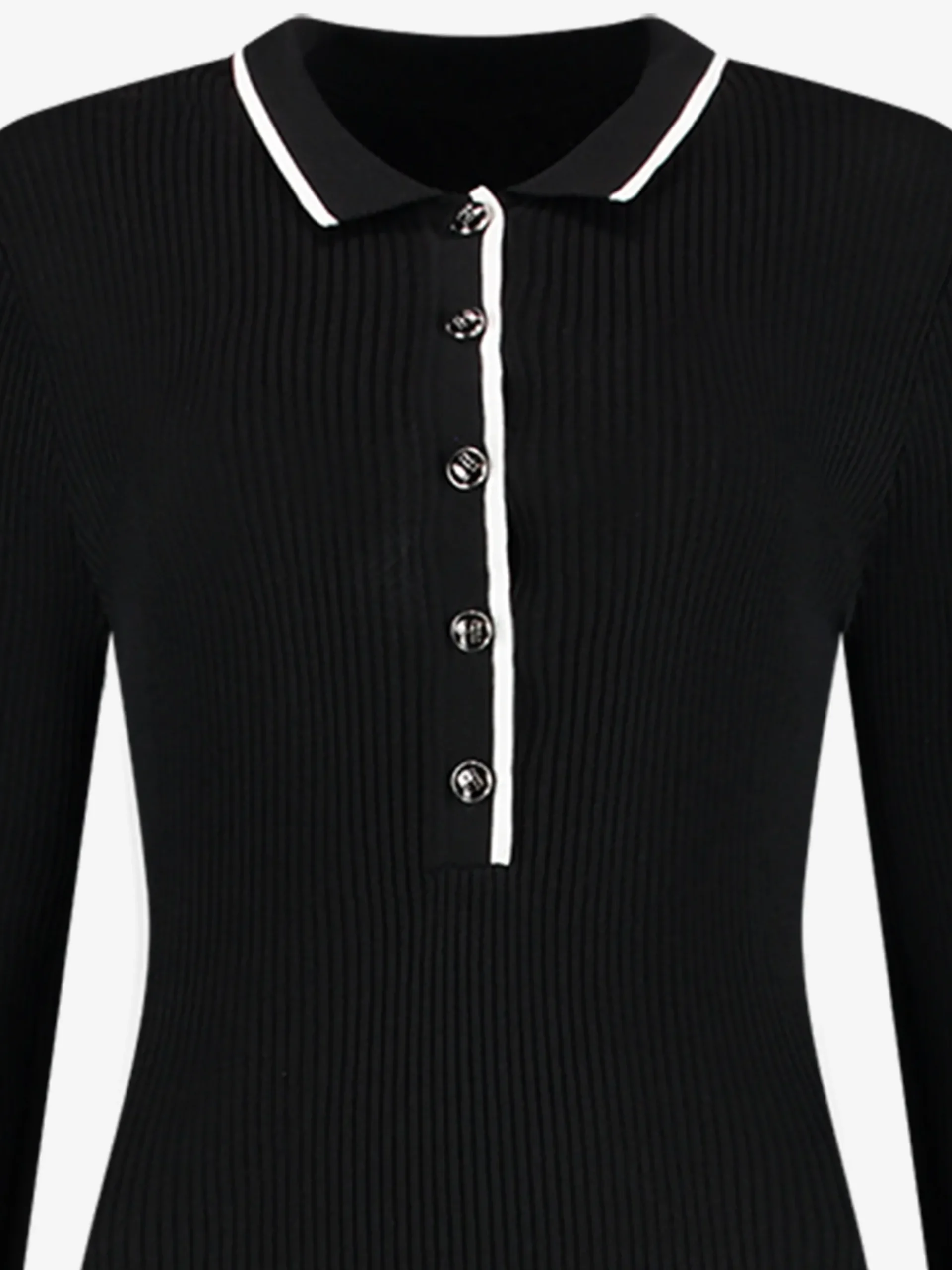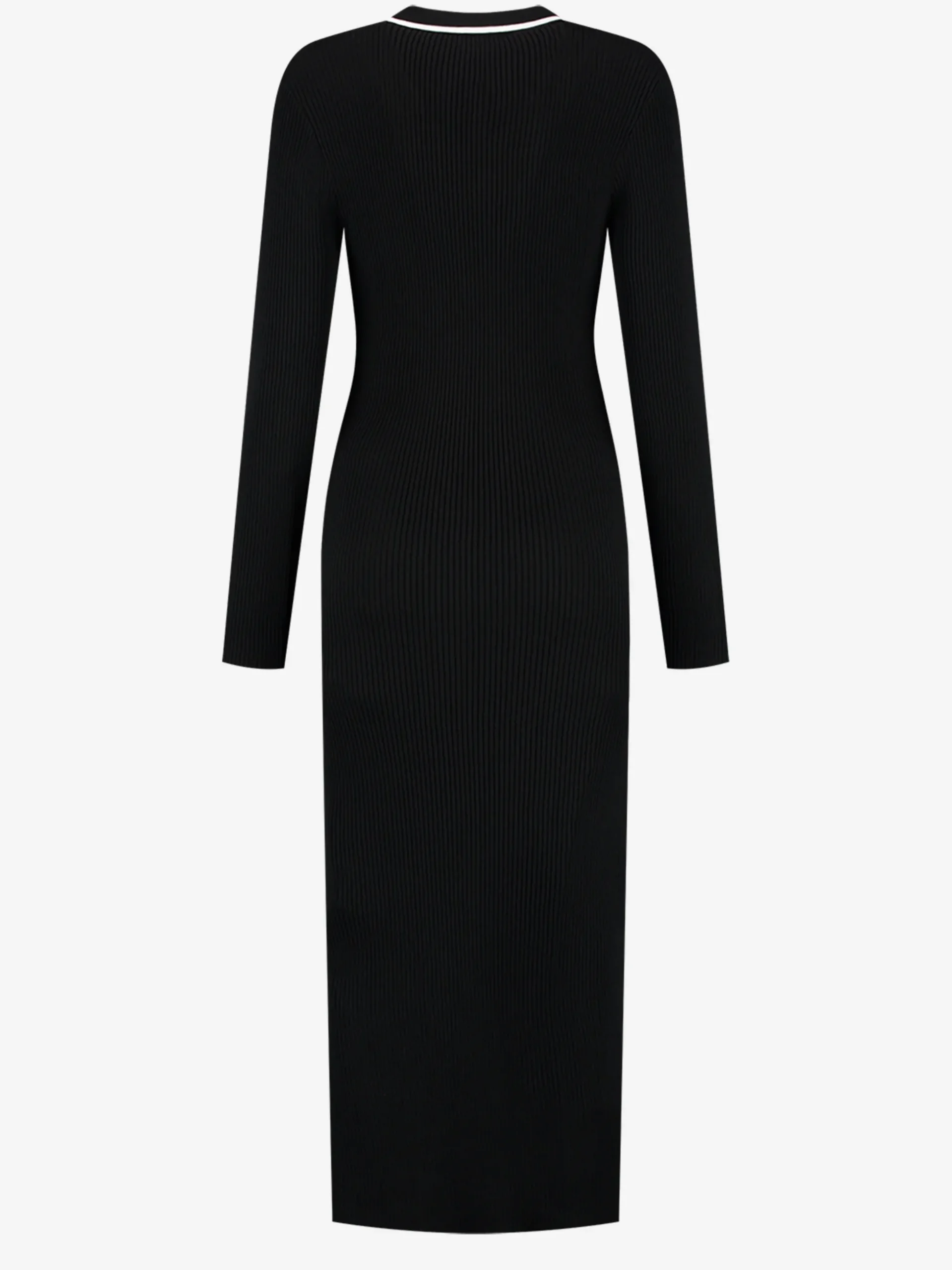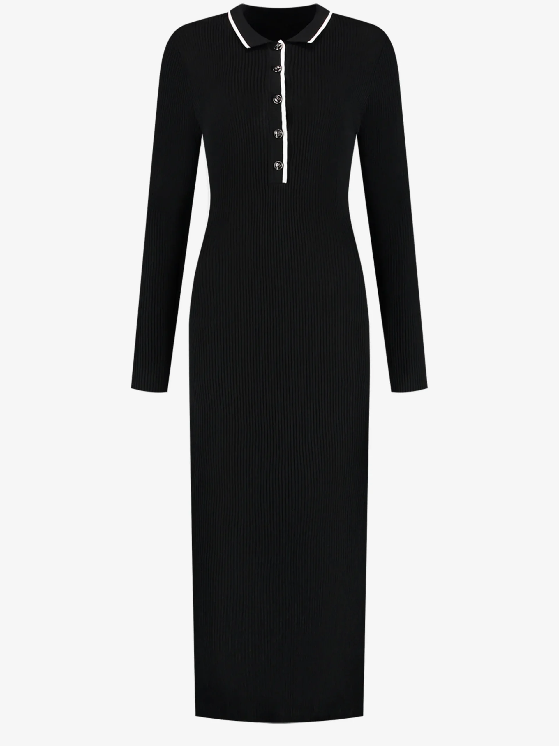 Lange, aansluitende jurk met een kraag en knoopdetails,gemaakt van geribbelde stof.
