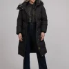 Lange puffer jas met capuchon en getailleerde taille. Dejas is voorzien van een rits- en drukknoopsluiting, handige zakken en een hogekraag.