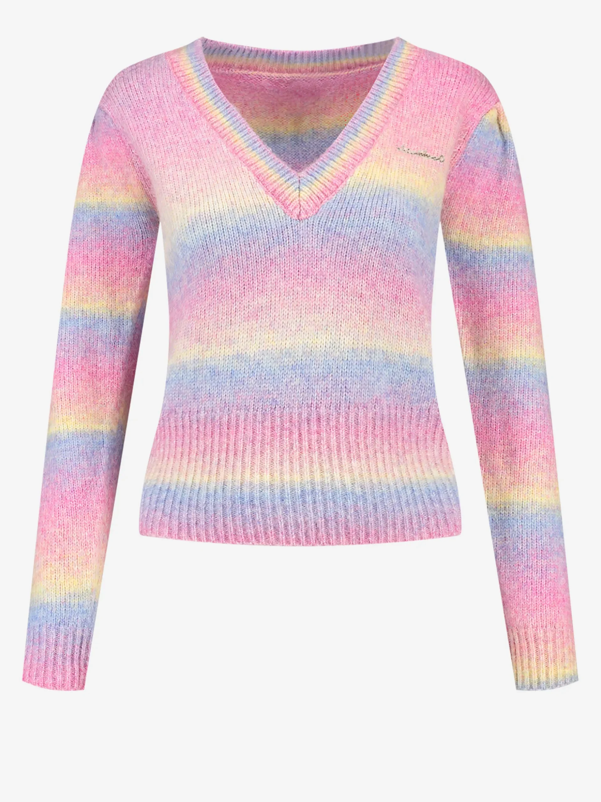 Trui met een meerkleurig gestreept patroon en een subtielNIKKIE-logo. De trui is gemaakt van een wolmix.