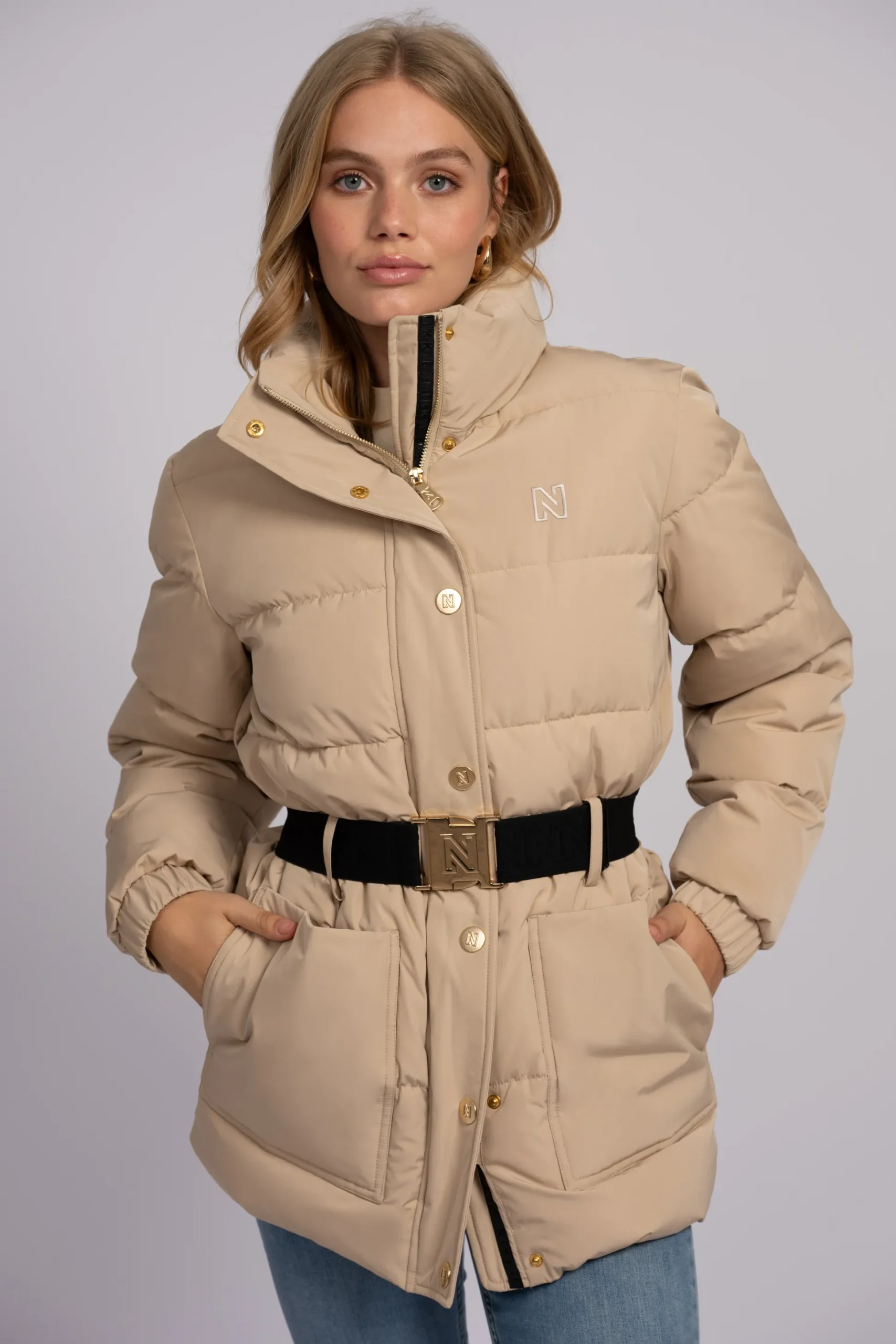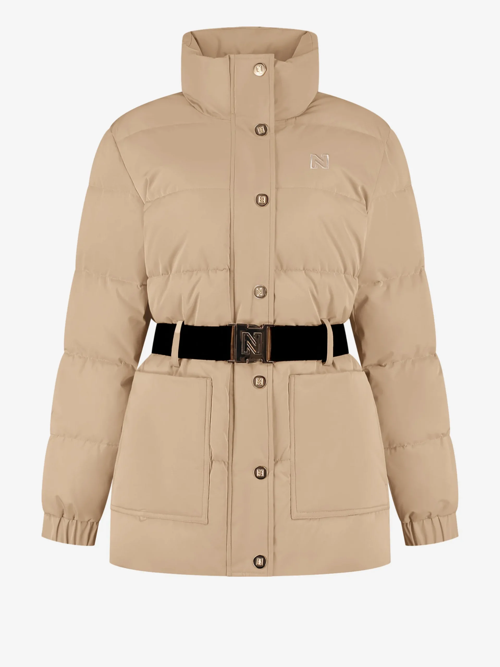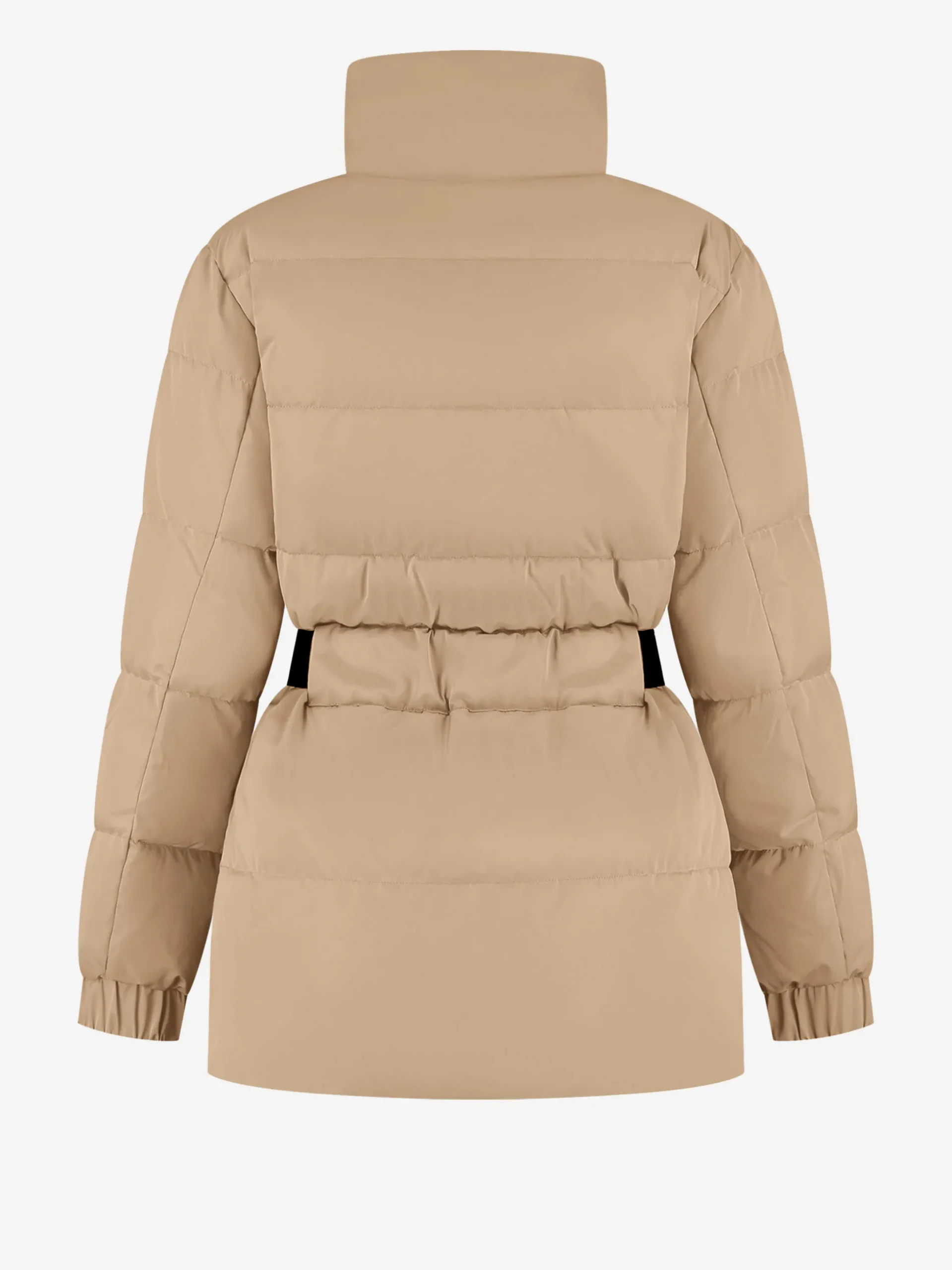 Puffer jas met hoge hals en riem
