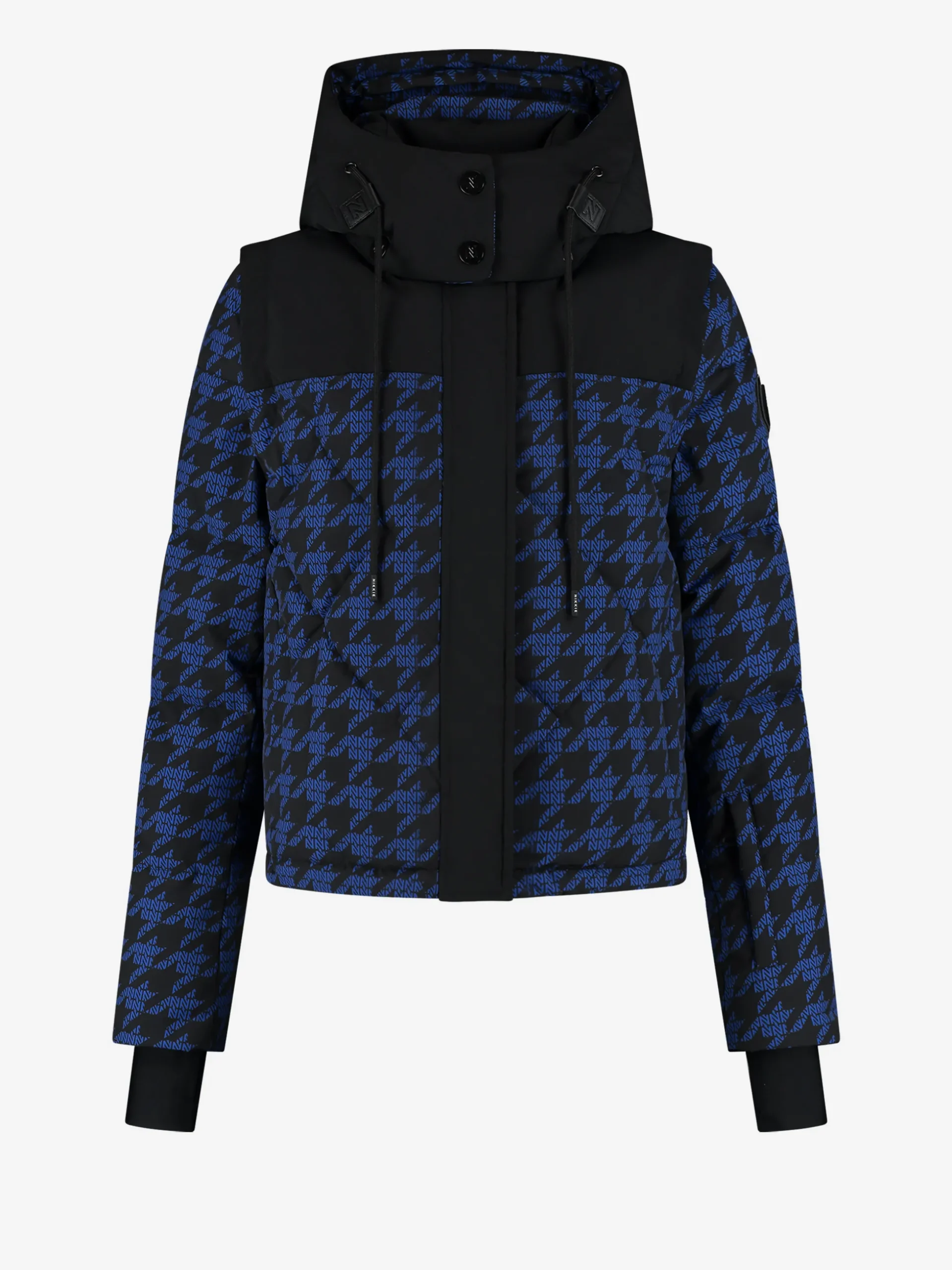 Deze ski jas heeft een logo patroon, rits- enknoopsluiting, en een opstaande kraag met afneembare capuchon. De jas heeftafneembare mouwen en een verstelbare elastische riem. Daarnaast beschikt hijover waterdichte ritsen, sneeuwvangers en diverse zakken, waaronder een vakvoor de skipas in de mouw. Het waterproof level bedraagt 10,000 mm en hetbreathability level is 3000 mm.