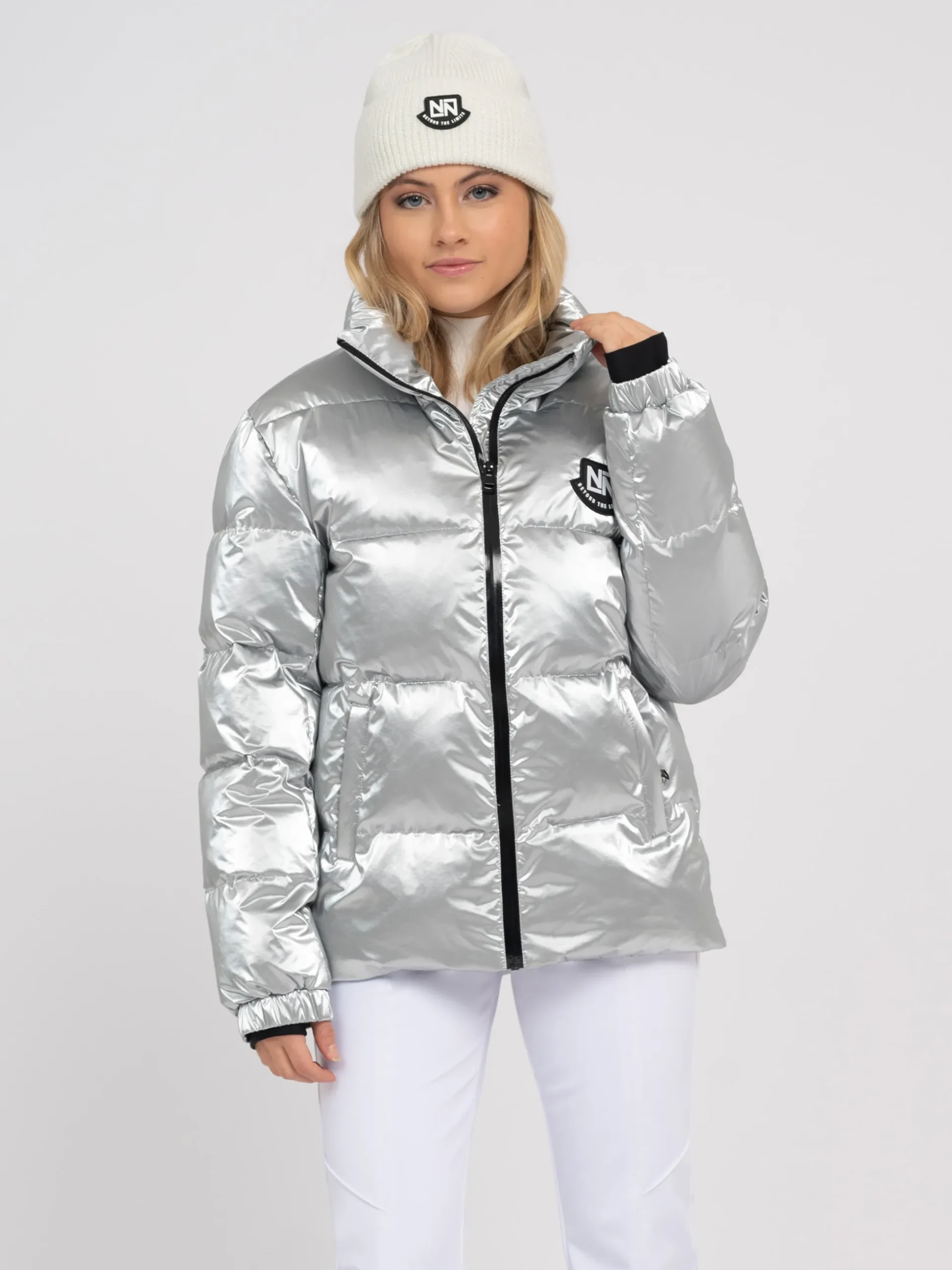 Deze ski jas heeft een metallic look en is uitgerust meteen hoge kraag en ritssluiting. Met een waterproof niveau van 10.000 mm blijvende vullingen droog, hoewel de buitenkant niet waterdicht is. De jas beschiktover sneeuwvangers aan de onderkant, een zakje voor je skipas op de mouw, enritszakken aan de voorkant en binnenkant. Daarnaast heeft de jas eenlosvallende pasvorm zonder stretch.